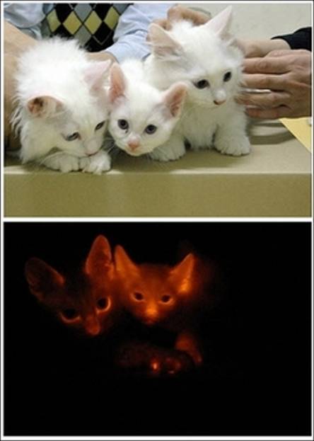 This handout photo released in Seoul by the Ministry of Science and Technology shows a combo of cloned cats that have a fluorescence protein gene and glowing under ultraviolet beams. The technology could help develop treatments for human genetic diseases, the developers said.