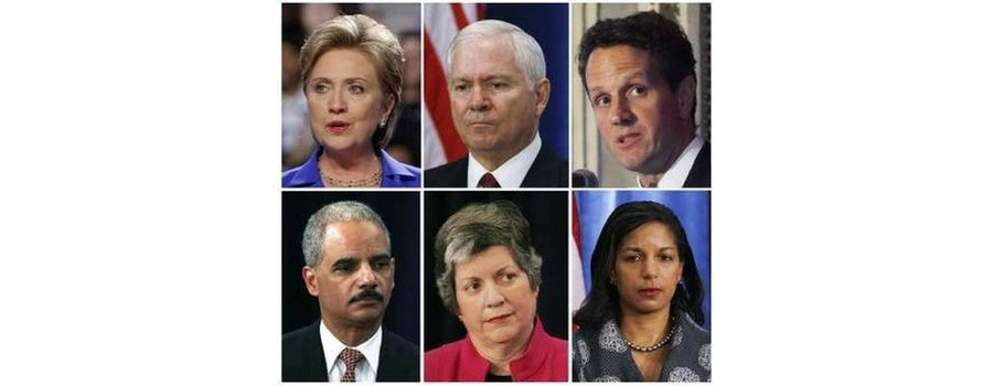 Nominees to Obummers adminstration are seen in this combination photograph taken between 2006-2008. Hillarity Clintoon, Secretary of Defense nominee Robert Gates, Treasury Secretary nominee Timothy F. Geithner, Ambassador to the United Nations nominee Susan Rice, Secretary of Homeland Security nominee Janet Napolitano and Attorney General nominee Eric Holder.