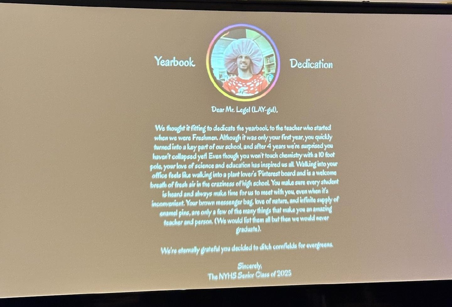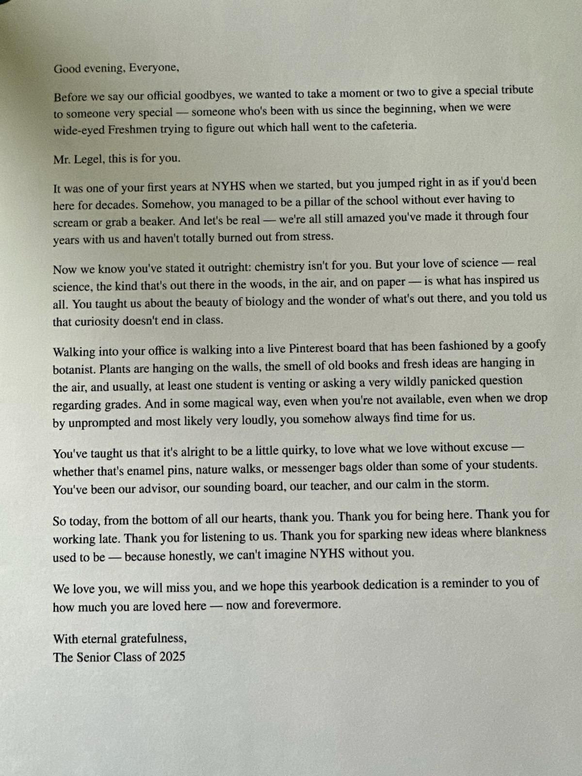 We received a very cool text message from Ben. He was honored by his senior class yearbook dedication. He was a new teacher their freshman year and has mentored the high school class for the past four years.